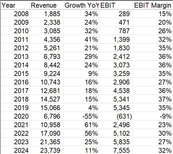 After the topsy-turvy first decade in the public market, Booking also matured into an incredibly well run, scalable marketplace in the internet! It’s hard to even “see” GFC in their numbers as the business just kept growing topline at higher than 20% every year between 2008 and 2014 (although some of these growth was inorganic in nature) while increasing operating margins from 15% in 2008 to 36% in 2014.