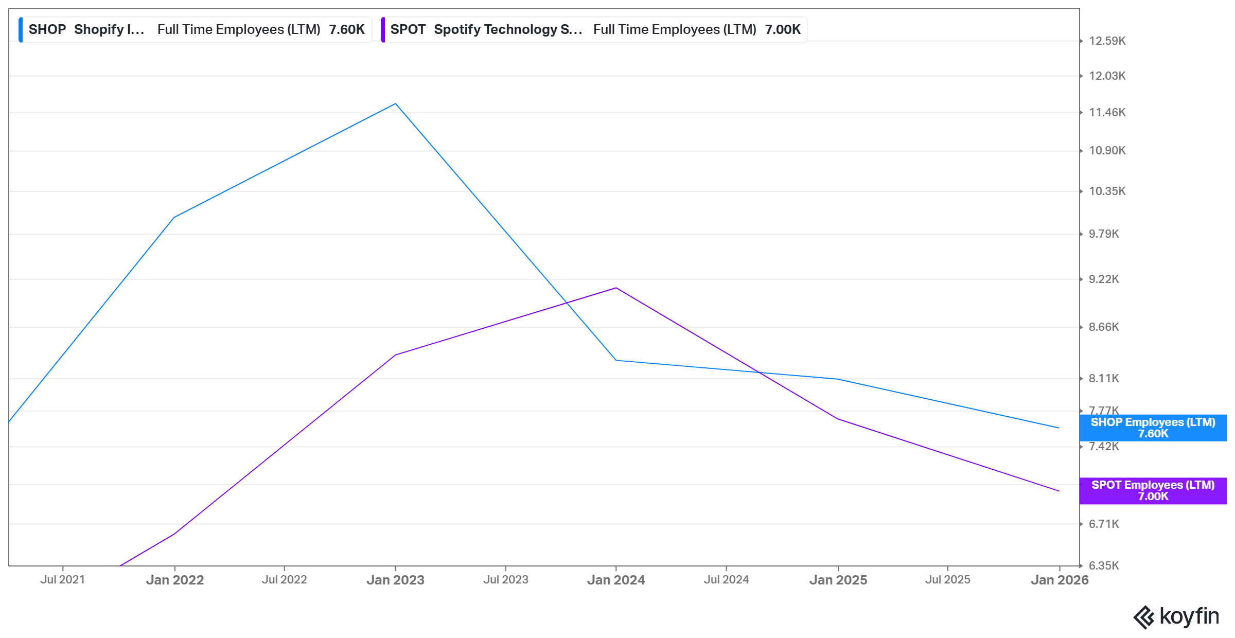 In fact, for all the effusive praises Daniel Ek at Spotify or Tobi Lutke at Shopify receive these days, I do wonder at times how on earth these founder led companies became so incredibly bloated in the first place. At least, Zuck had his “monopoly” profits to fund science projects at Reality Labs, but Spotify and Shopify both operate in a much lower gross margin and competitive market.