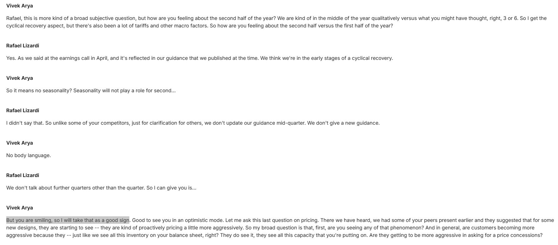 You hardly ever see sell-side analysts being livid to management in an earnings call, but TXN’s 2Q’25 call was a bit spicy. After the prepared remarks, Q&A started with a combative tone from an analyst probing management about “change of tone” compared to last quarter. Then couple other analysts also pressed on “tone”.