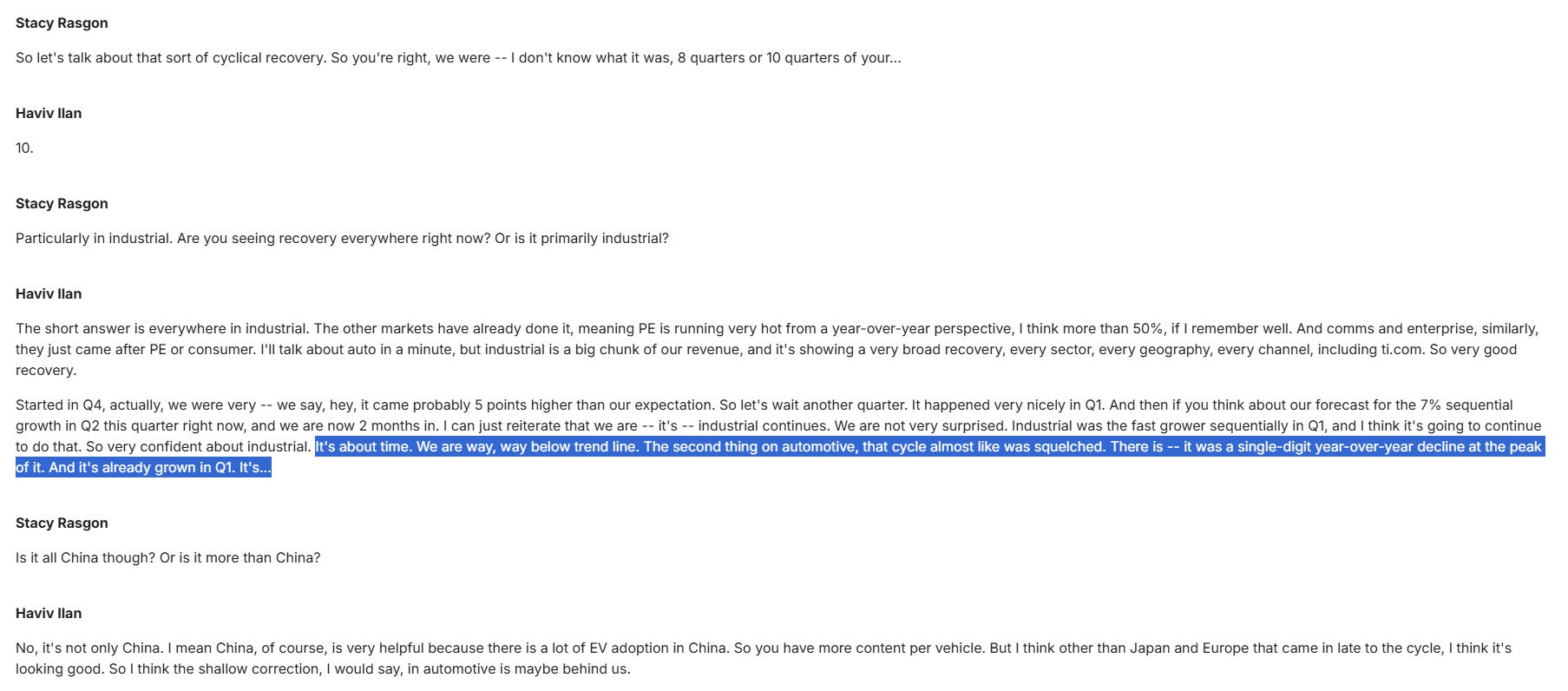 “…automotive, let's just remember that it's kind of a year delayed versus industrial, right? Industrial peaked for us at least in the third quarter of 2022. Automotive picked 1 year later in the third quarter of 2023. So one could expect automotive to be joining last. The automotive recovery has been shallow, meaning we are running single digits versus the peak, we are running year-over-year. We are actually having some growth in the second quarter from a year-over-year perspective, but at a very low level. So I will say that automotive has not recovered yet. But because of content growth, I think the cycle here is going to be less pronounced and more shallow.”