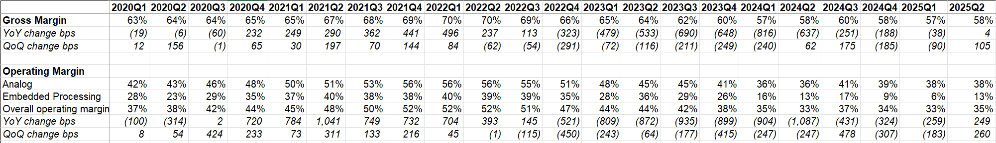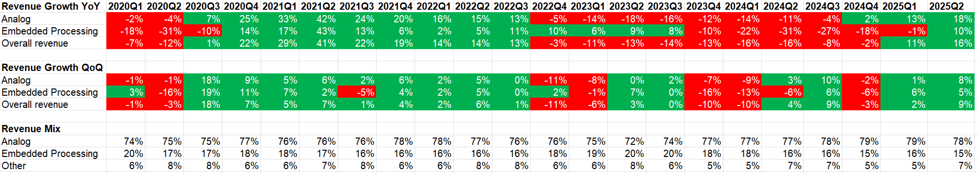 I have shown below revenue growth by segment from both YoY and QoQ perspective. As you can see, the cycle has clearly turned. Analog revenue, which is ~80% of overall revenue, accelerated from ~13% YoY in 1Q’25 to ~18% in 2Q’25. Similarly, sequential revenue accelerated from ~1% in 1Q’25 to ~8% in 2Q’25.