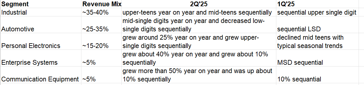 In terms of end markets, I have gathered management’s commentary in both 2Q’25 and 1Q’25. Apart from automotive which declined by LSD sequentially (but was +MSD YoY), every other end market grew both sequentially and YoY. Industrial, which is the largest segment, accelerated from HSD sequential growth in 1H’25 to mid-teens sequentially.