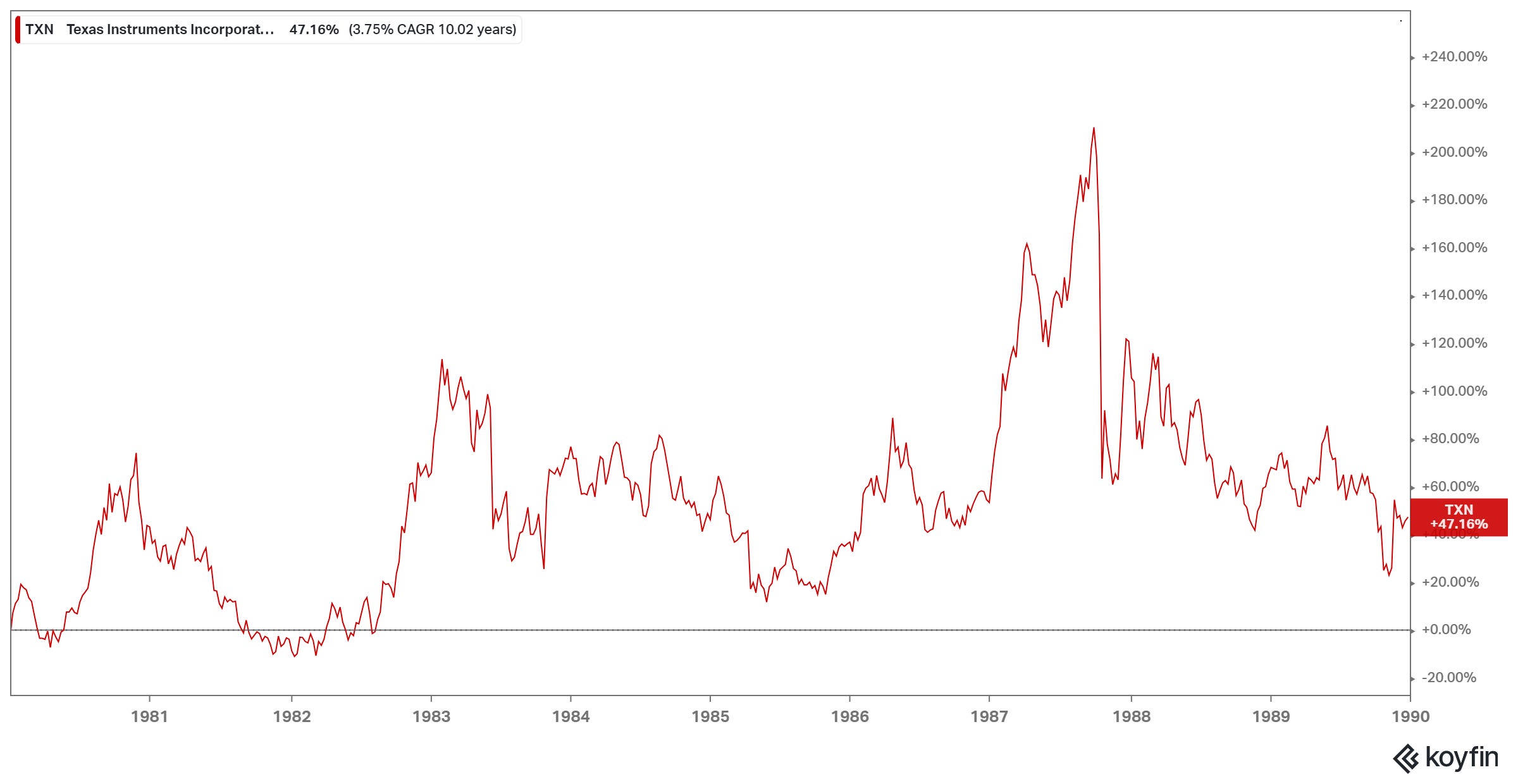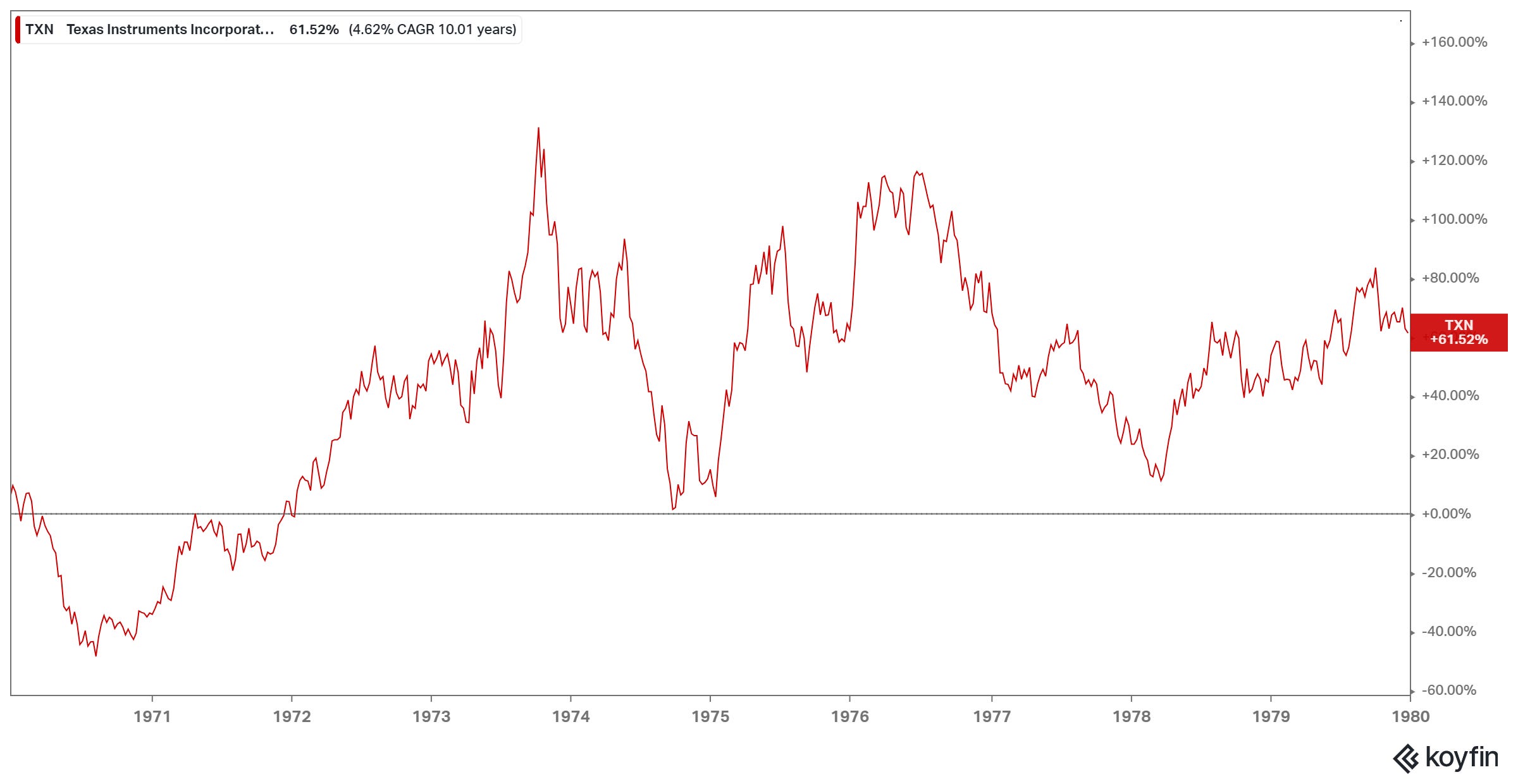 While new technical gadgets such as calculators, digital watch, and LCD watches started gaining wider adoption among consumers, price war ensued among the competitors which made profits lot more volatile and uncertain. Thanks to strong semiconductor demand and the very profitable defense electronics segment, TI still did okay during the ‘70s as revenue increased from $1 Bn in 1973 to $3 Bn in 1979. While the stock only generated ~4.6% CAGR, S&P 500 compounded at only ~2% during the ‘70s.