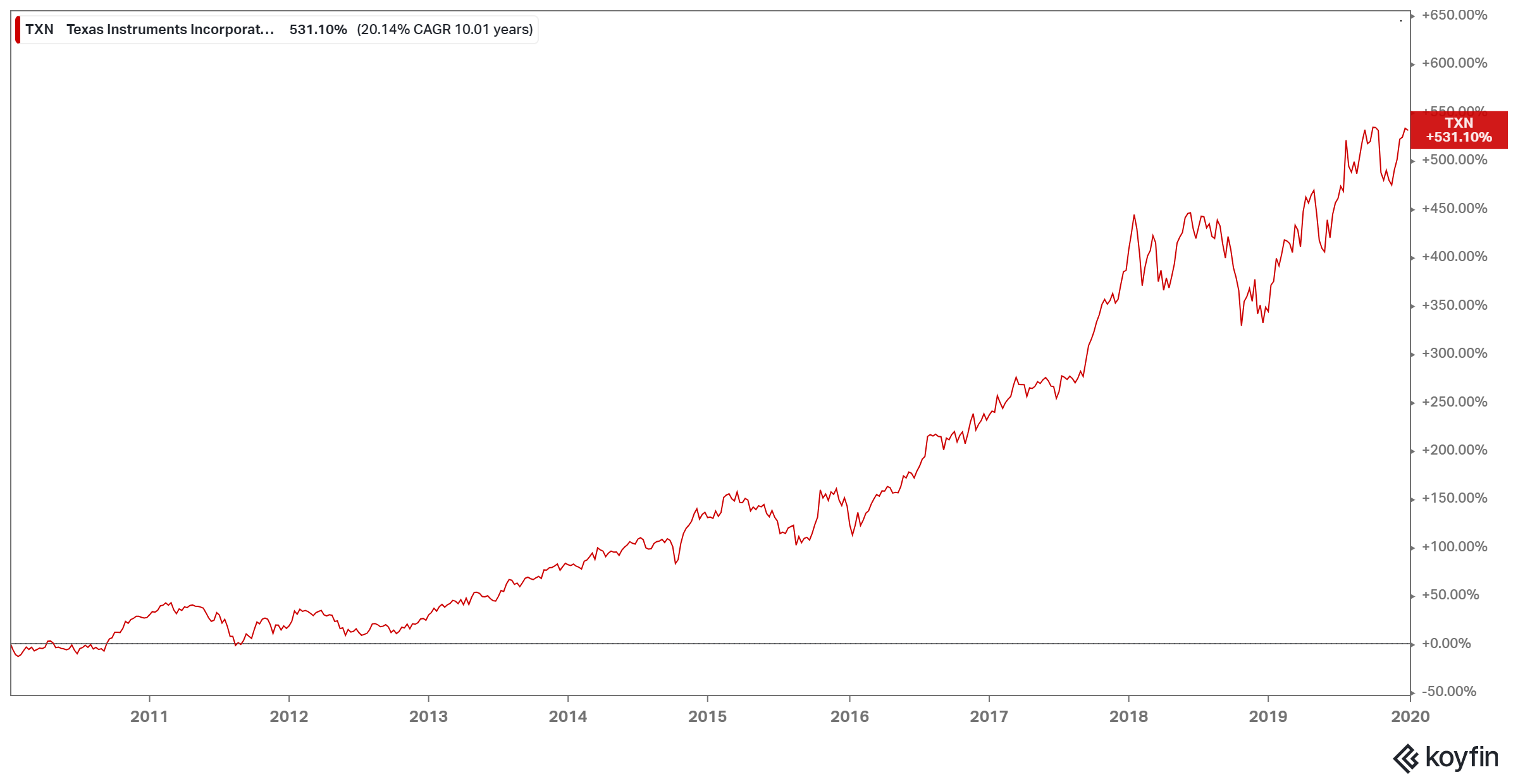 Then of course the first decade of the 21st century started with the crash of the tech bubble. TI’s revenue fell by a whopping ~31% in 2001. It took TI nearly five years to exceed its revenue in 2000. Just as it started to recover, Global Financial Crisis (GFC) hit the economy and TI’s revenue declined for three consecutive years. As you can imagine, it was a sorry decade for TI and its shareholders.