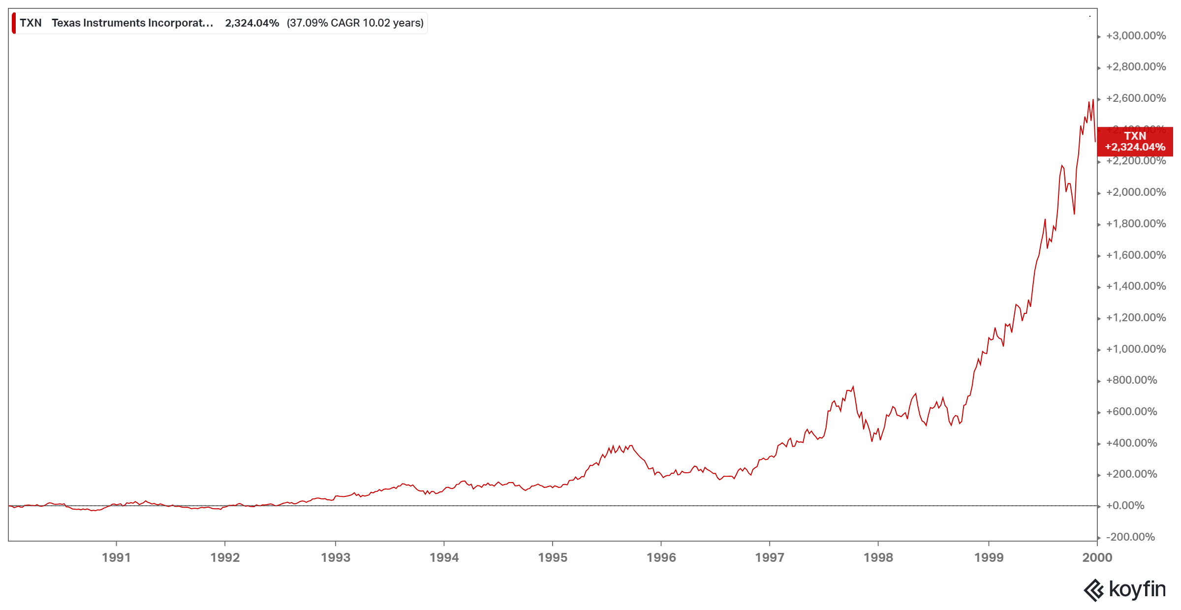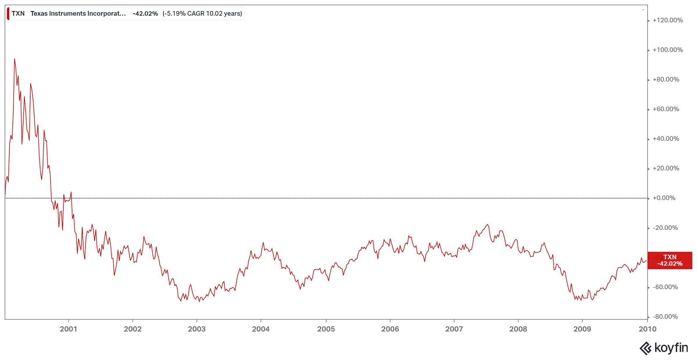 Then the 80s was a challenging decade for TI. While the stock generated 3.75% CAGR return in this decade, it severely underperformed S&P 500’s ~13% CAGR return this decade. In the late ‘70s, TI entered the home computer market which also eventually ended up in a price war that led to TI’s first ever loss of $145 Mn in 1983. TI’s presence in both consumer and industrial markets often led to shortages of components and reduced shipments. They incurred another loss year in 1985. In the late ‘70s, TI set an ambitious goal of reaching $15 Bn revenue by 1990. The actual revenue ended up being only ~$6 Bn when TI ended the decade of ‘80s. Their market share in semiconductor also fell precipitously from ~30% to just 5% over the course of this decade. No wonder TI’s stock lagged S&P 500 considerably!